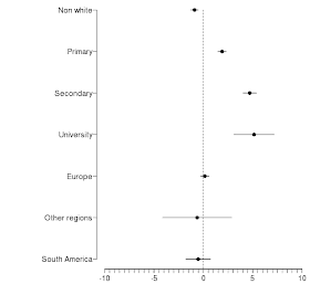 Resultado: Aqueles com grau universitário eram 5 centímetros mais altos que os analfabetos (os indivíduos de referência) e o local de nascimento não teve influência nas alturas dos adultos.